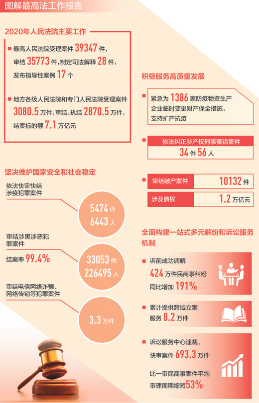 2020年,人民法院堅定不移貫徹新發展理念,緊扣全麵建成小康社會(hui) 目標任務依法履職盡責,審結一審民商事案件1330.6萬(wan) 件、行政案件26.6萬(wan) 件,積極服務構建新發展格局、推動高質量發展。