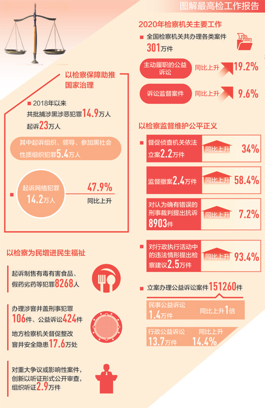 2020年,刑事檢察更加有力,民事檢察更為(wei) 精準,行政檢察持續做實,公益訴訟檢察有序拓展,檢察機關(guan) 在嚴(yan) 格依法履職中促進社會(hui) 公平正義(yi) 。