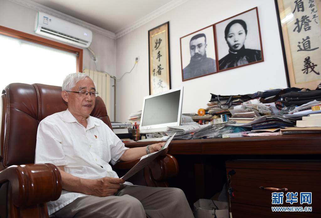6月12日,李宏塔在家中書(shu) 房讀書(shu) ,牆上掛著祖父李大釗和祖母趙紉蘭(lan) 的相片。新華社記者 周牧 攝