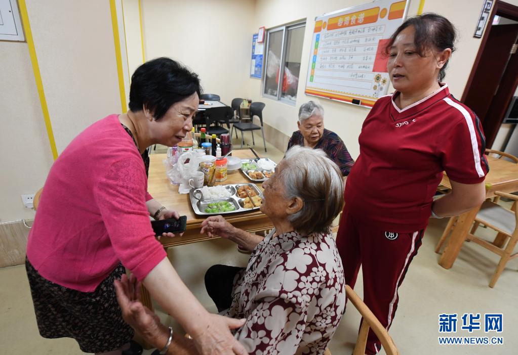 林丹(左一)在社區居家養(yang) 老服務中心向徐佩英老人了解飲食健康情況(6月23日攝)。新華社記者 林善傳(chuan) 攝
