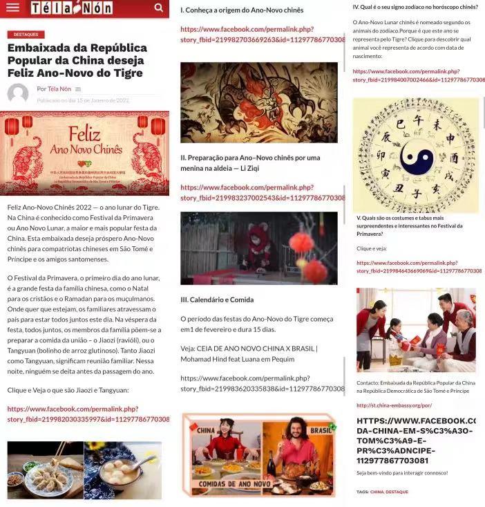 春節前夕,中國駐聖多美和普林西比使館在當地主要門戶網站特拉儂(nong) 網(Téla Nón)設立虎年春節專(zhuan) 欄,向廣大旅聖普僑(qiao) 胞、中資機構和留學生以及聖普人民送上新春祝福,並介紹中國春節習(xi) 俗趣事,掀起迎接中國新年的熱潮。