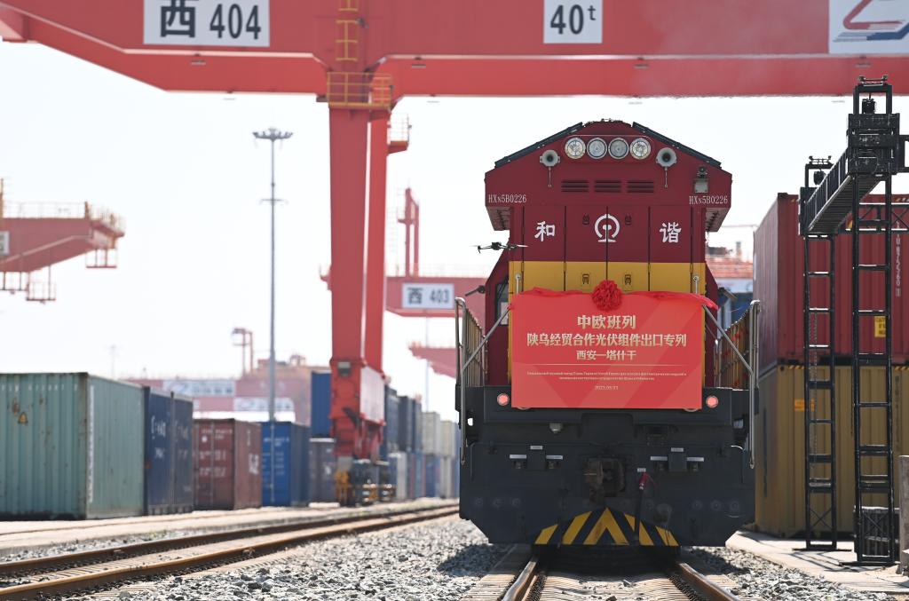8月3日,中歐班列(西安-塔什幹)陝烏(wu) 經貿合作隆基綠能光伏組件出口專(zhuan) 列在西安國際港站準備發車。新華社記者 鄒競一 攝