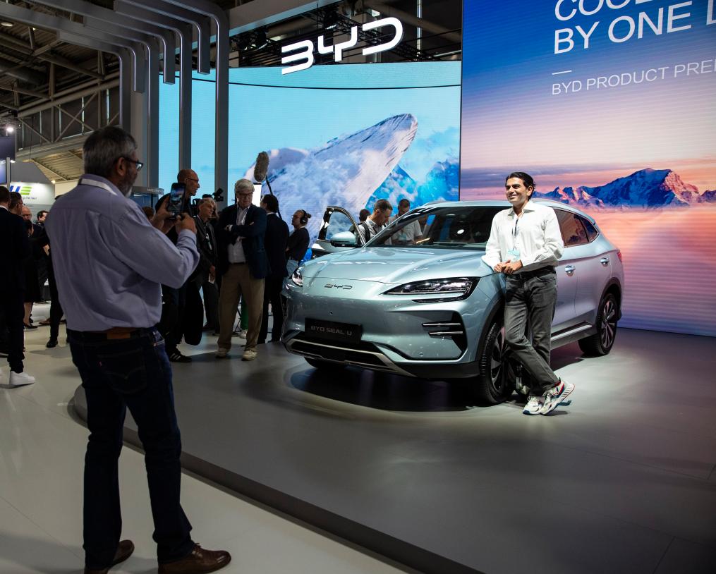 9月4日,在德國慕尼黑國際車展媒體(ti) 預展上,參觀者在比亞(ya) 迪品牌發布會(hui) 現場與(yu) BYD SEAL U汽車合影。新華社記者 張帆 攝