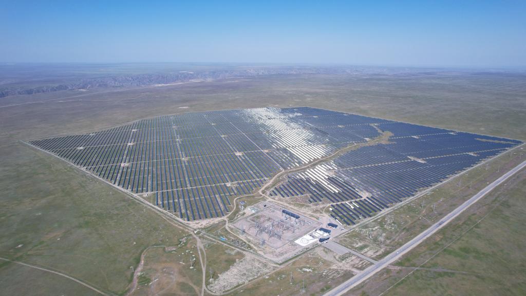 這是5月4日在哈薩克斯坦阿拉木圖州拍攝的卡普恰蓋100兆瓦光伏電站(無人機照片)。這是哈薩克斯坦單體(ti) 最大的光伏發電項目之一,也是中哈綠色能源合作項目之一。新華社發(奧斯帕諾夫攝)